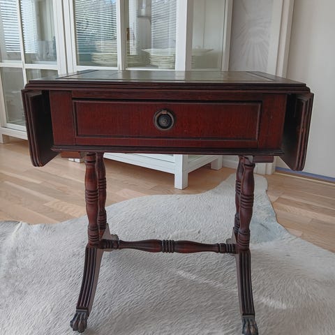 Pöytä on hyvässä kunnossa, vain pieniä elämänjälkiä näkyvissä.