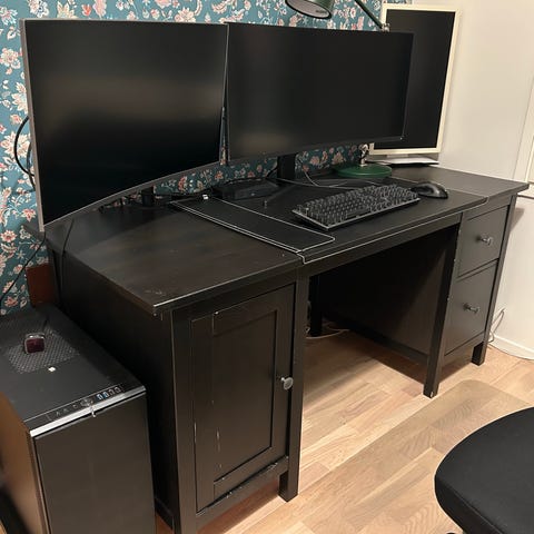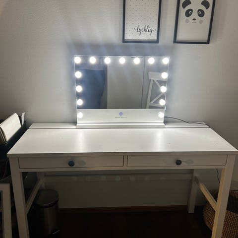 Ikean valkoinen hemnes työpöytä. Pöydän alareunassa maalikulunut, mutta saa tarvittaessa korjattua helposti valkoisella tussilla.