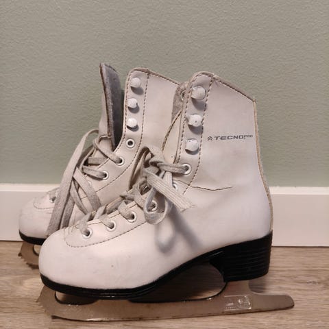 SP luistimet, lasten koko 31. Väri valkoinen. Käytettyjä luistimia, joissa on perinteinen nauhoitus ja terät. Soveltuvat erilaisiin luistelulajeihin. Ehjät, mutta käyttökulumaa löytyy.