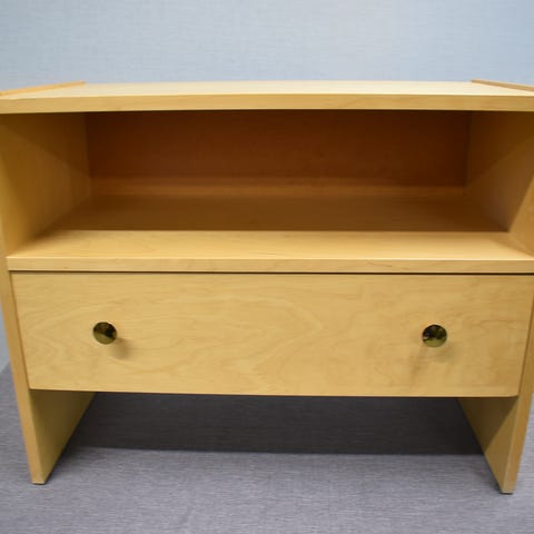 Puinen yöpöytä, ruskea väri, yhdellä laatikolla ja kaarevilla jaloilla. Sopii makuuhuoneeseen tai muuhun tilaan, jossa tarvitaan pientä säilytystilaa ja tasoa. Tarvitsee liimausta tasolevylle ja jaloille.