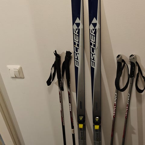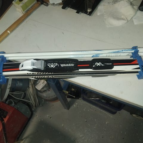 Karhu-merkkiset sukset, pohjissa pitokourut. Sauvat 105cm.