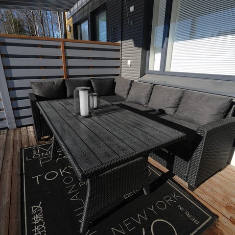Sisältää kulmasohvan lasikanttisella pöydällä. Sohvassa ja rahissa on vaaleanruskeat pehmeät tyynyt. Setti soveltuu parvekkeelle tai terassille ulkokäyttöön. Pehmusteet ovat uusittu, ja pestävät sillä niissä on vetoketjut.