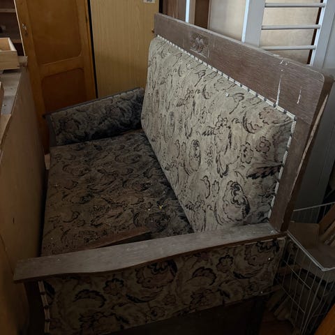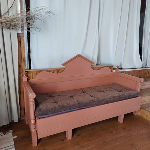 Antiikkityylinen puinen sohva ja seinähylly, lattialamppu