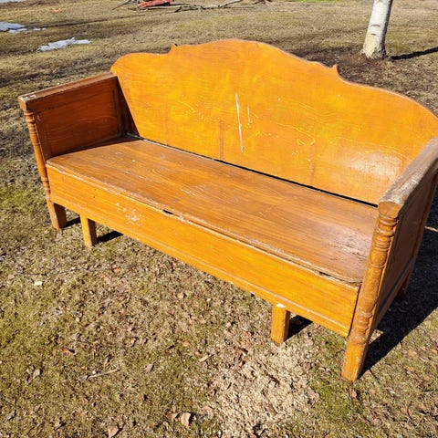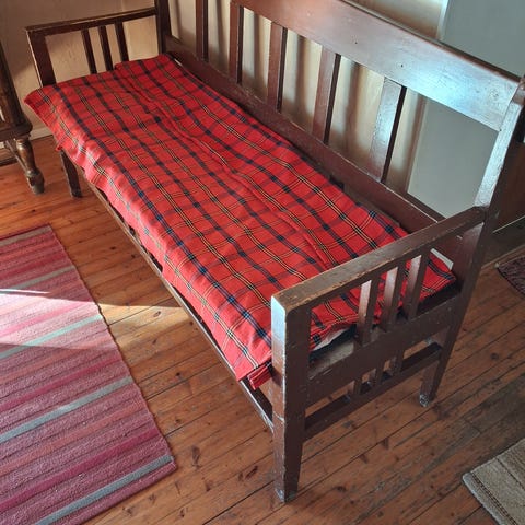 Antiikkityylinen puinen sohva, jossa korkea selkänoja. Mukana seinähylly jossa vetolaatikko ja avoin hyllytila. Lisäksi lattialamppu, jossa pyöreä jalusta ja pitkä varsi. Huonekalut soveltuvat sisustukseen, jossa arvostetaan perinteistä ja rustiikkista tyyliä.