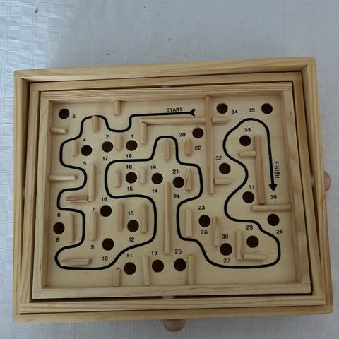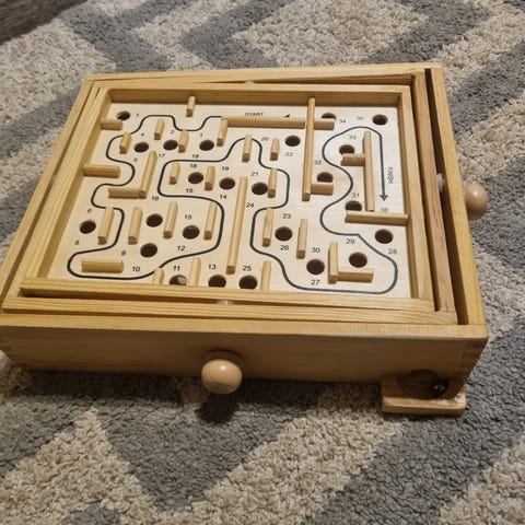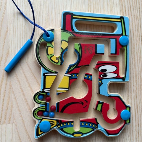 IKEA labyrintti lasten lelu, jossa puinen runko ja värikkäitä muovisia helmiä metallisilla langoilla. Lelu on suunniteltu kehittämään lapsen motorisia taitoja ja sopii lasten leikkeihin.