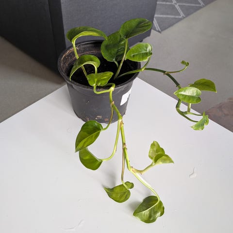 Enkelinsiipi (begonia) huonekasvi. Kasvaa kovaa vauhtia ja tekee todella suuria lehtiä, mutta itsellä ei ole enää tilaa tälle. Tällä hetkellä 12cm muoviruukussa, ja kasvusuunta sivuun, joten ei pysy pystyssä ilman tukea. Kannattaa siis vaihtaa painavampaan ruukkuun ja virittää kasville tuki. Aluslautasta ei ole, ja kastelupallo ei tule mukana