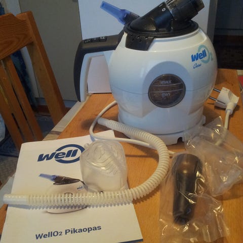 Puhdistettu,desinfioitu,vähällä käytöllä ollut apu hengityksen vahvistamiseen.(Googleta hakusana WellO2.