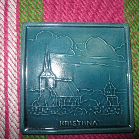 Käsin maalattu Langinkoskea esittävä seinälautanen, halkaisija 11,5 cm.