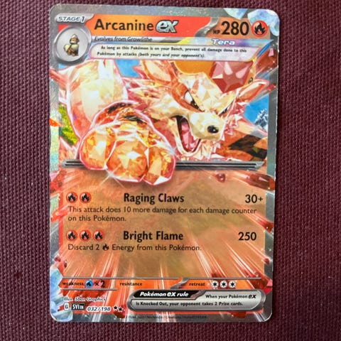 Pokémon Arcanine keräilykortti, jossa on 100 HP ja kaksi hyökkäystä: Flamethrower (50 vahinkoa) ja Take Down (80 vahinkoa). Kortti on osa Legendary Pokémon -sarjaa ja sisältää tietoa Arcaninen pituudesta ja painosta.