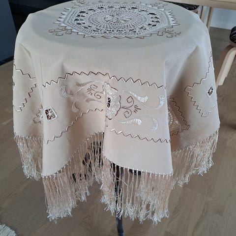 Vanha pöytäliina. Ikäisekseen hyväkuntoinen. Epäilys Tampella tai Finlayson kankaasta.