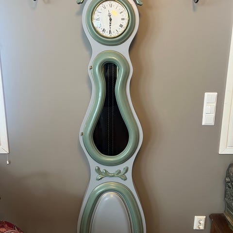 Puinen seinäkello, mekaaninen, jossa on heiluri. Kellossa on klassinen pyöreä kellotaulu mustilla roomalaisilla numeroilla ja mustilla viisareilla. Sopii seinälle kiinnitettäväksi ja ajan näyttämiseen.