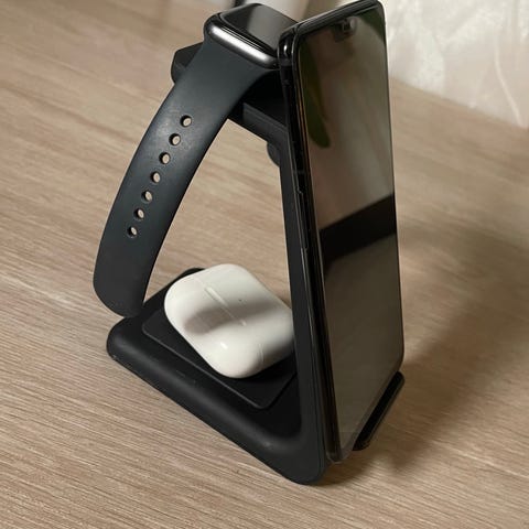 Apple Watchille ja hieman vanhemmille iPhoneille sopiva latausteline. Tuossa on kännykälle Lightning-pistoke eli ”se pienempi”. Myydään tarpeettomana.
