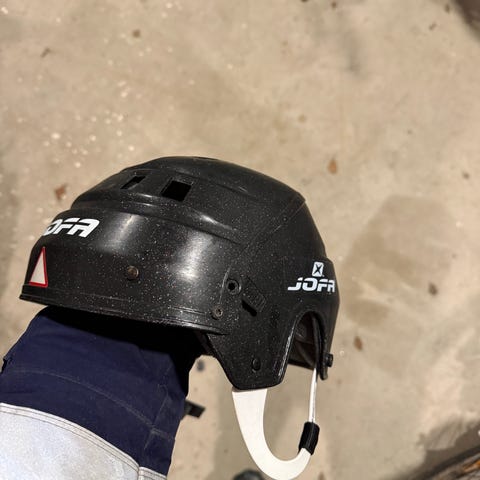 Bauer jääkiekkokypärä valkoisena, varustettu ristikolla.