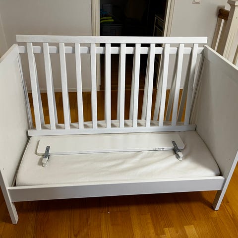 Myydään valkoinen Ikean Sundvik pinnasänky. Sängyssä pinnasängyn turvalaita ja Nattapa-turvalaita myöhempää vaihetta varten. Patja mukaan.