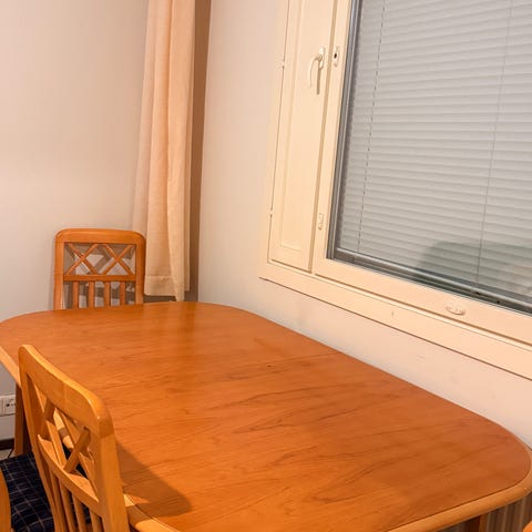 Suomalainen desing ruokapöytä. Pöytä on puuta ja tukeva. Pöytälevyssä on käytönjälkeä. Pöydän ympärille mahtuu jopa 7 henkilöä hyvin istumaan.