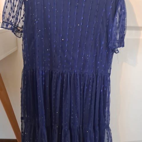 Mingnelin-merkkinen tummansininen juhlamekko koko 152. Mekossa kohokuvioita ja satiininauhavyö. Kunto siisti, en löytänyt moitteita.