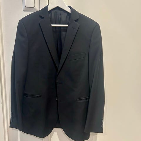 Takki on kokoa 52 slim fit, housut 33-34. Puku on höyrytetty viimeisimmän käytön jälkeen.