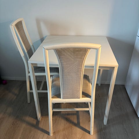 Kuvanmukainen baarityylinen pöytä ja 2kpl tuoleja myynnin. Pöydässä näkyy pieniä naarmuja, jotka käyvät kuvista ilmi.