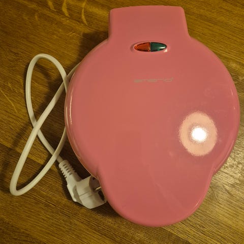 Emerio WM-121854 kuplavohvelirauta vaaleanpunaisena. Laite on tarkoitettu kuplavohvelien paistamiseen. Siinä on sähköinen virtajohto ja pyöreä muoto, jossa on useita kuplamuotteja vohvelien muodostamiseksi.
