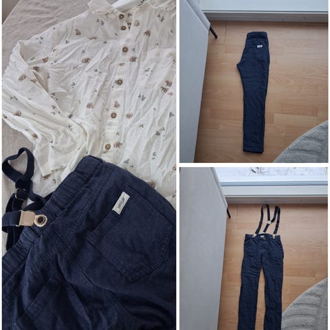 Löytyy myös samaa kokoa pellavan tyyliset puuvillaiset tummansiniset juhlahousut missä irrotettavat henkselit