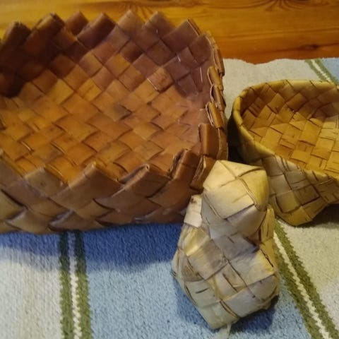 Käsintehty tuohireppu. Muuten hyvä kunto mutta toinen olkain puuttuu.