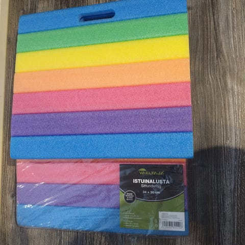 5 taitettavaa istuinalustaa, joista 2 ovat uusia. Vaeltaja lämpöistuinalusta 38 x 28 / 6 cm. Käytetyistä harmaa on myös Vaeltaja- merkkinen, 2 mustaa jotain muuta. Käytetyissä normaalia käyttökulumaa ja muutama valuvirhe tai kipinä osunut (kuoppa, mutta ei puhki).
