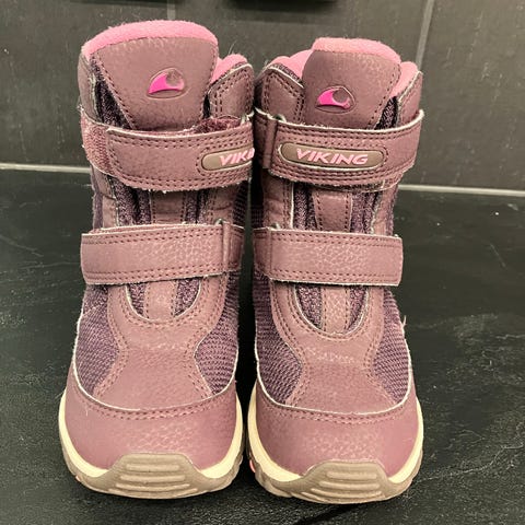 Viking- merkkiset lasten talvikengät, koko 31. Edessä on kaksi tarraa jotka pysyvät hyvin kiinni.kengän sisällä on karvavuori
