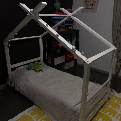 Siistikuntoinen itsetehty talosänky 70x150 cm lasten patja sopii runkoon.