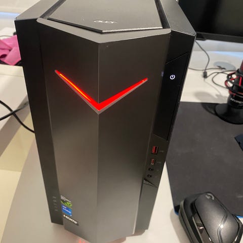 Acer pöytätietokone, jossa Intel Core i5-10400F prosessori 2.9 GHz, NVIDIA GeForce GTX 1650 Super näytönohjain, 8 GB ddr4 RAM-muistia ja 512 GB tallennustilaa. Musta kotelo, sopii pelaamiseen