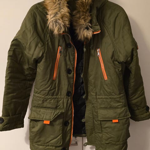 Vihreä, hieman pidempi malli. Erittäin hyvässä kunnossa, kankaassa ei tahroja tai jälkiä. Veden- ja tuulen pitävä.