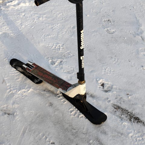 Stigan lumipotkulauta. Säädettävä tangon korkeus. Telat kunnossa, pientä käytönjälkeä. Pitäisi liukua hyvin eteenpäin. 15e