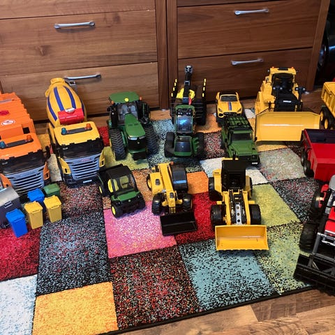 Ovat hyvässä kunnossa, ehjiä ja toimivia, jotkut kuin uusia, mutta pieniä käytönjälkiä voi olla toisissa ja sinisestä traktorista puuttuu toinen ovi.