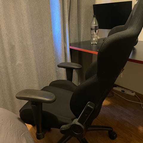 Pelituoli. Toinen kahva ei laske tai nouse. Selkä muokattavuus toimii. Myöskään välillä ei pysty nostamaan tai laskemaan.