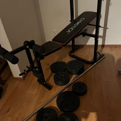 Gymstick painonnostopenkki, sisältää tangon, painolevyjä 37,5 kg ja käsipainot.