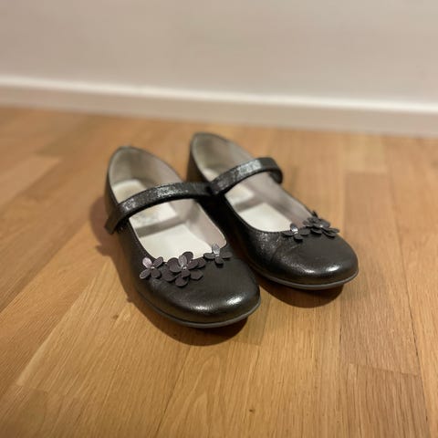 Lasten kengät tytöille, koko 36. Väri hopea, materiaali sisältää kiiltäviä yksityiskohtia. Kengissä on remmi varmistamassa istuvuus.