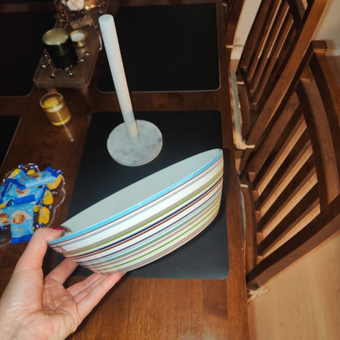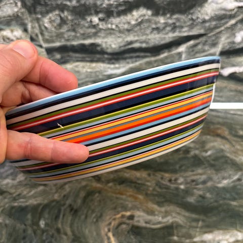 Iittala Origo-sarjan iso tarjouilukulho, jossa on monivärinen raidallinen ulkopinta ja valkoinen sisäpinta. Uutena meille ostettu ja käytetty vain muutamia kertoja. Mieluiten nouto Hyvinkäältä, mutta tarvittaessa voidaan sopia postituksesta ostajan kustannuksella.