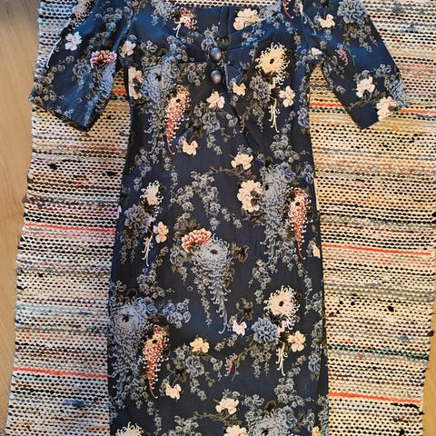 Sinisellä pohjalla värikäs, lintuaiheinen kuvitus. Kaula-aukossa kiva helmikoristelu.