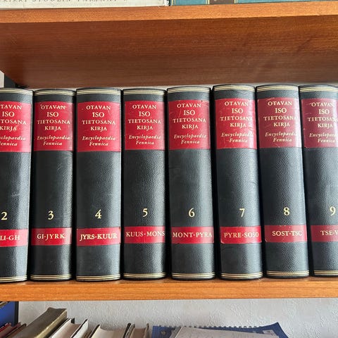 Annetaan ilmaiseksi vanha Otavan tietosanakirjasarja osat 1-10. Suurin osa kirjojen kansista on tyydyttäväkuntoisia, mutta itse kirjan sisukset taas ikäisekseen hyväkuntoisia. Parin kirjan kansien liimaukset ovat pettäneet, mutta ne ovat liimattavissa. Tarjolla myös muualla.