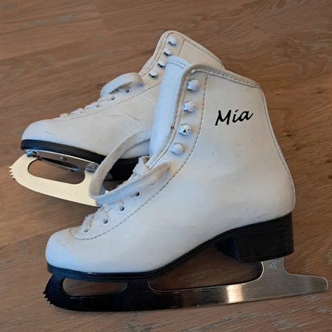 Mia lasten luistimet, koko 33, valkoinen väri. Hyväkuntoiset luistimet valmiina käyttöön. Koko 33 ja terät ovat terävät. Teräsuojat sisältyvät kauppaan.