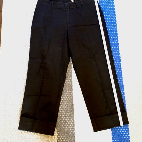 Pitkälahkeisissa kokomerkintä 36 (toiset 100% pellavaa ja kevyesti käsin lyhennetty lahkeita, toiset pehmeää mokkatyylistä materiaalia).