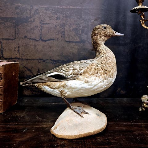 Muuta: Tässä on kauniisti täytetty lapasotkanaaras, joka saapui meille edesmenneen biologian opettajan kokoelmasta. Lintu edustaa 1900-luvun luonnonhistoriallista taksidermiaa ja sen pyrkimystä tallentaa myös yleisiä merilintuja tieteellisiksi ja museaalisiksi näytteiksi. Naaraslapasotka on hillityn ruskeasävyinen ja rakenteeltaan jykevä, mikä tekee siitä tyypillisen sukeltajasorsan – hiljaisen, mutta vaikuttavan hahmon. Lapasotkanaaras symboloi pohjoisten vesien rauhaa ja puhtautta. Upea kohde esimerkiksi luonnonhistorian keräilijälle, taksidermian harrastajalle tai meriantiikkia arvostavalle.