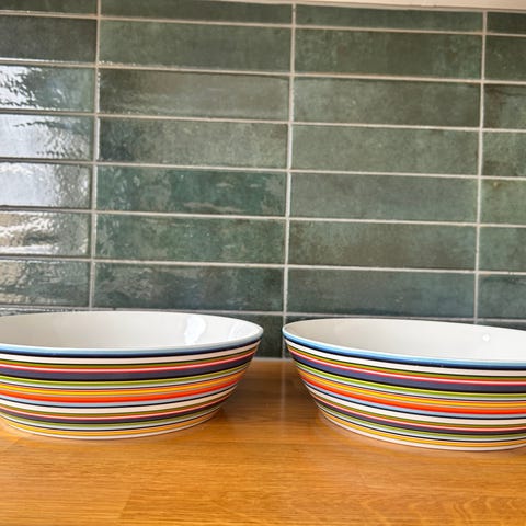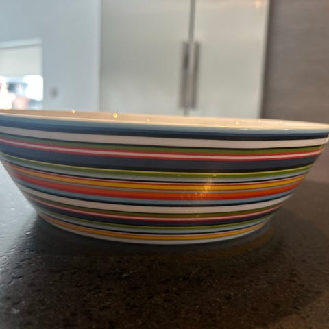 Iittala Origo-sarjan iso tarjoilukulho, jossa on monivärinen raidallinen kuviointi. Materiaali keramiikka. Meille uutena ostettu ja edelleen siisti ja ehjä seuraavalle. Mieluiten nouto Hyvinkäältä, mutta tarvittaessa voidaan sopia postituksesta ostajan kustannuksella.