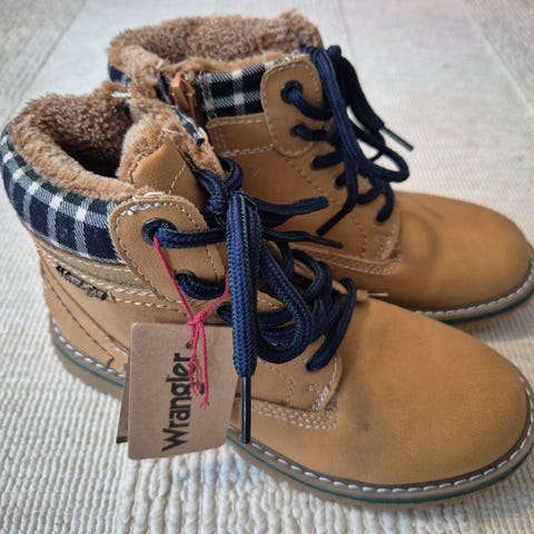 Nupukkinahkaiset Wrangler merkkiset lasten talvinilkkurit. Lämmin vuori ja vetoketjut sivuilla. Kunto kuin uusi. Koko 33, pohjallisen pituus 22 cm. Väri vaaleanruskea.