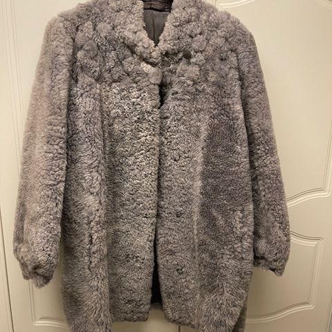 Myydään erittäin hyväkuntoinen, ehjä ja puhdas harmaa vintage lammasturkki. Vuorikangas moitteeton. Karvakin hienossa kunnossa, vain oikeassa hihansuussa ja pätkässä helmaa vähän kulumaa (katso kuva). Valmistettu Suomessa, merkki VL-Turkis, Made by Valmislakki Oy, Koskenkorva. (Google kertoi, että yritys oli keskittynyt Islannin lampaasta tehtyihin tuotteisiin.) Koko 38, mitat: olkapäästä helmaan 72 cm, kainalosta kainaloon 56 cm, hihan pituus olkasaumasta hihansuuhun 55 cm. Hintapyyntö 150 €.
