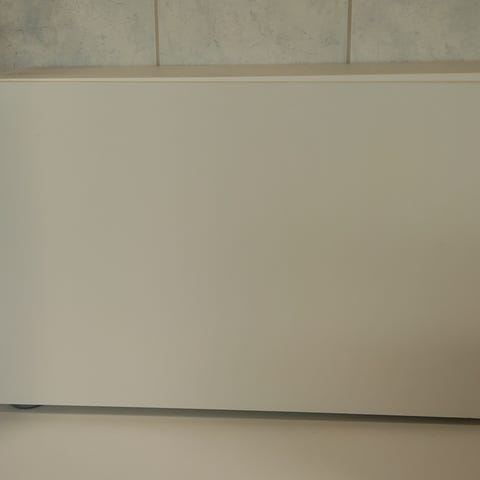 Ikean Bestå kiiltävä valkoinen kaappi. Muutama lisähylly tulee mukana. Omat kantajat mukaan.