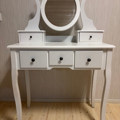 Myynnissä kampauspöytä. Pöydän kannessa elämänjälkiä. Haku Outokummusta.