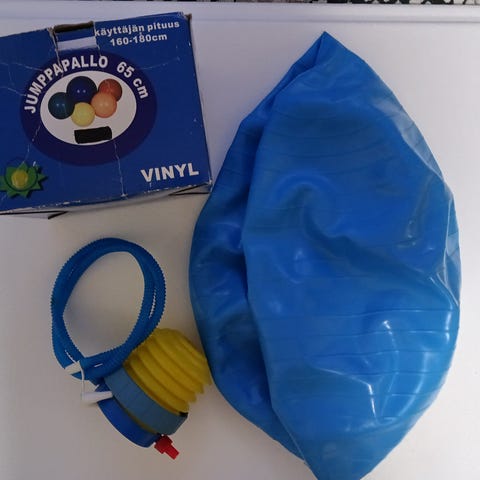 Hyväkuntoinen 60 cm jumppapallo pumpulla helppoa täyttöä varten.