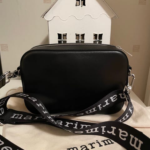 Marimekko Gratha, nahkainen, musta ja säädettävä musta-valkoinen olkahihna, jossa Marimekon logo.