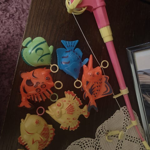 Kalastuspeli, jossa on värikkäät kalat ja 3 onkea. Yksi kala rikki, mutta ei vaikuta pelaamiseen.
