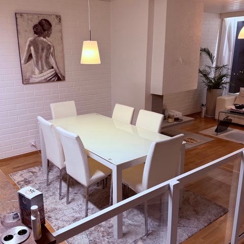 Tästä kotiin lasinen pöytä joka on hyvässäkunnossa ei lohkeamia tai säröjä mukaan saa kuvan valkoiset tuolit jos haluaa mutta tuolit ovat aika rujossa kunossa